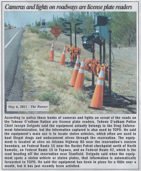 You can be sure the Tohono O'odham Nation did not pay for these camera systems. As the article above indicates, the DEA owns this equipment & undoubtedly struck a deal with the TOPD to share information with them in exchange for allowing them to be setup in the area. It also wouldn't be surprising to learn if access to federal grant money wasn't also part of the deal.