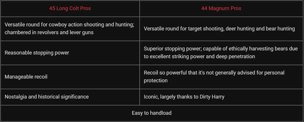 45 Long Colt vs. 44 Magnum Comparison Chart
