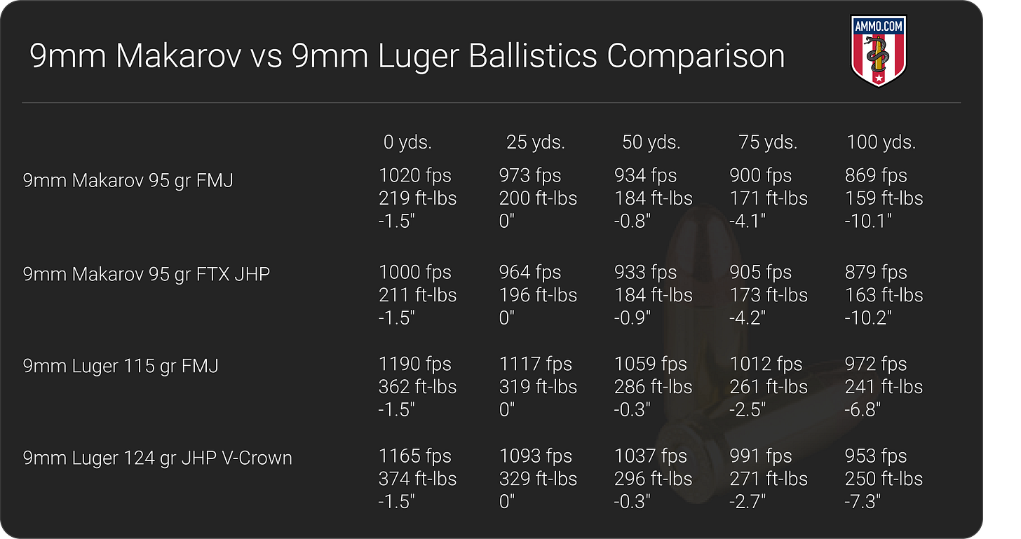 Thanks to its greater case capacity, the 9mm Luger is superior to the 9mm Makarov in every ballistic category.