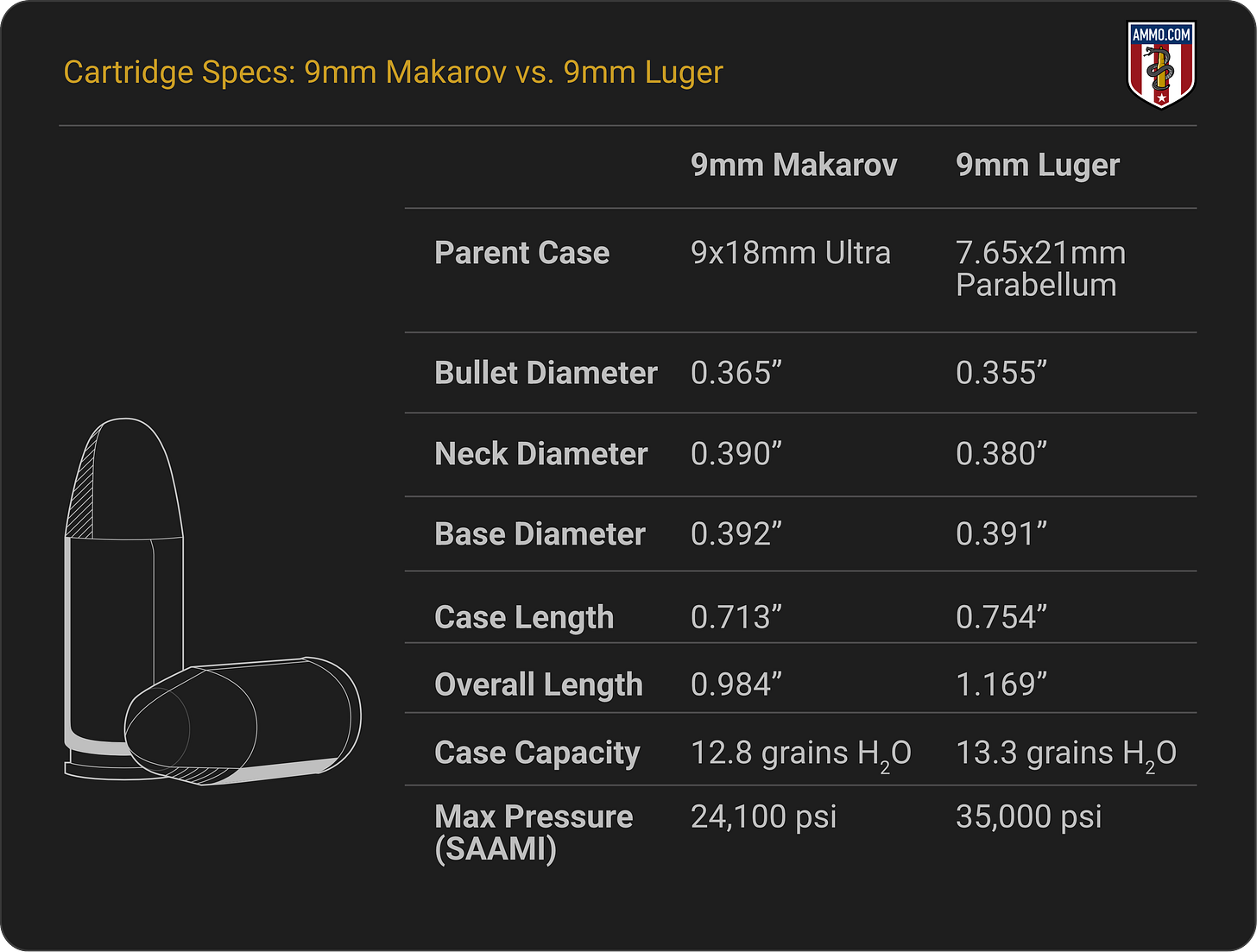 The key difference between the 9mm Makarov and 9mm Luger is this: the 9mm Luger has a larger case capacity and is superior to the 9mm Makarov round in all ballistic categories. The 9x18mm Makarov also fires lighter bullets: typically 95 grains, as opposed to the 115 to 147 grain bullets fired by the 9mm.