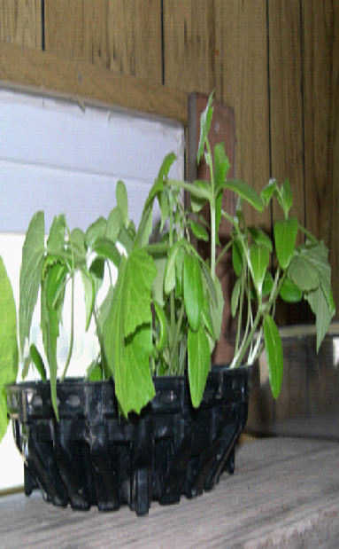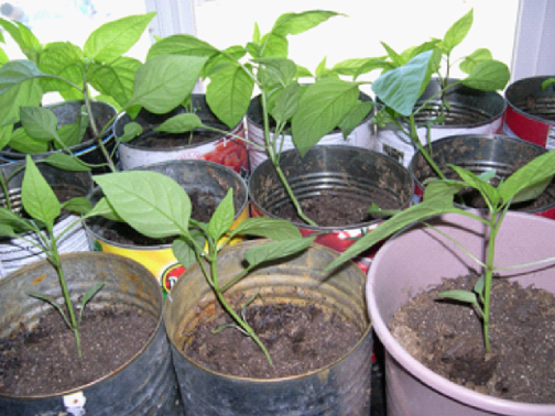 I used pie plates with clear plastic tops and plastic containers from the supermarket as mini-greenhouses to start the seeds, then transplanted them into large cans.