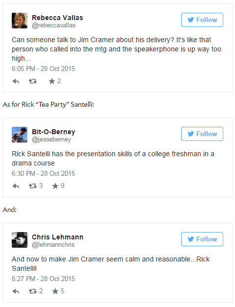 But mostly CNBC's debate was mess—and to regular CNBC viewers, a familiar one. How bad was it? Straight-ahead moderators John Harwood and Becky Quick seemed to be broadcasting from Planet Face the Nation, lobbing serious policy questions. Meanwhile, the more flamboyant Cramer and Santelli practically competed for overacting honors.