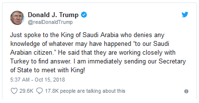 • Zero Hedge - Tyler DurdenAccording to Trump, the King also said that "they are working closely with Turkey to find answer" and added that he is "immediately sending" Secretary of State Mike Pompeo "to meet with King."