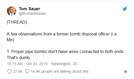 "Proper pipe bombs don't have wires connected to both ends. That's dumb," observed Tom Sauer, who describes himself as a former bomb disposal officer. "A proper timer would best be stored inside the pipe, making it fully encapsulated," he says. "This is nearly the same as a bundle of road flares wrapped together with an old-timey alarm clock ticking away."
