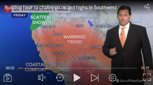 • AccuweatherFollowing near-normal temperatures to start the week, a major change is on the way for much of the West by week's end. While many areas will encounter unseasonable warmth by the weekend, AccuWeather forecasters say a few triple-digit temperatures more typical of late June or early July are expected.