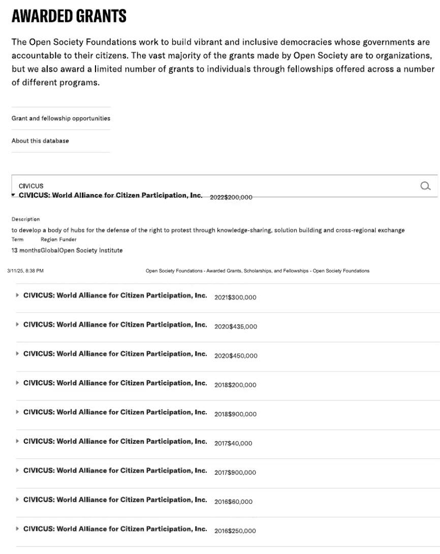 CIVICUS is a nonprofit that received more than $3.5 million in donations from George Soros's Open Society Foundations from 2016 to 2021, according to a Headline USA review of a grants database.