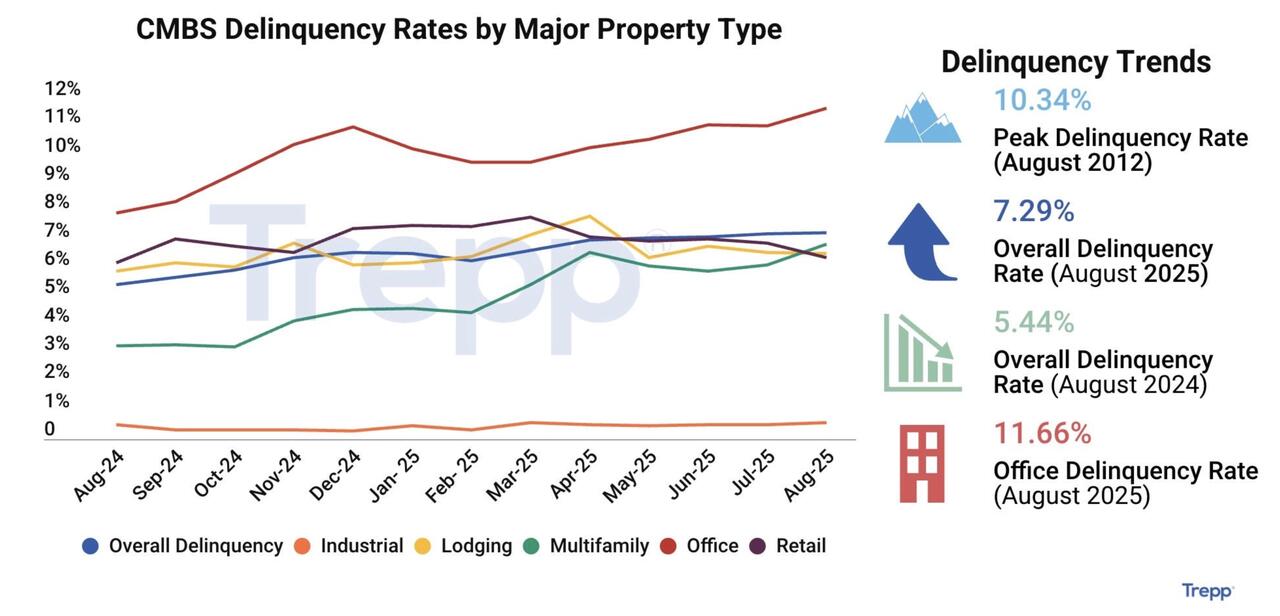 New York was in the middle of converting 4.1 million square feet of offices into housing, the most since 2008.? CMBS delinquency rates had risen for six straight months through August, hitting 7.29% overall and 11.66% for office loans, both records.² ³