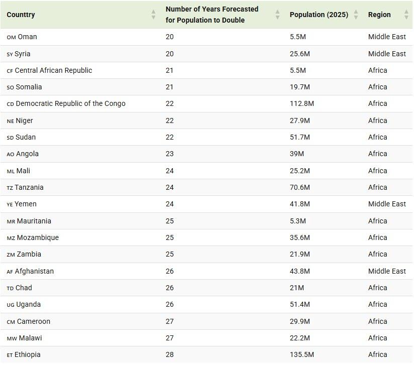 Below, we show countries with the fastest annual doubling rates at current projections: