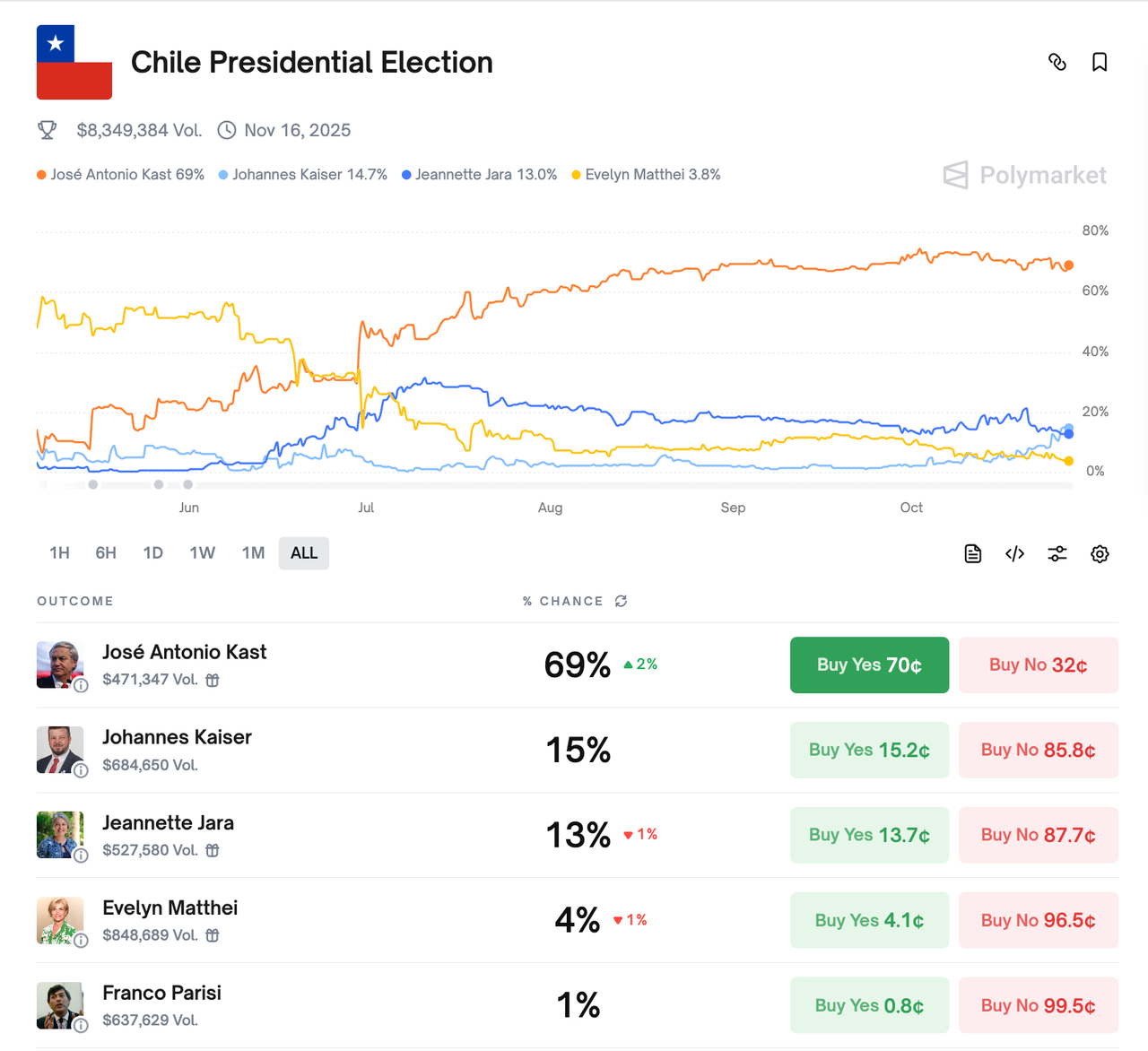 Cryptocurrency-based prediction market Polymarket shows a potential victory for conservative free-market candidate Jose Antonio Kast, who is politically aligned with Jair Bolsonaro in Brazil and Milei in Argentina. The trend suggests that socialist power in Latin America may be weakening.