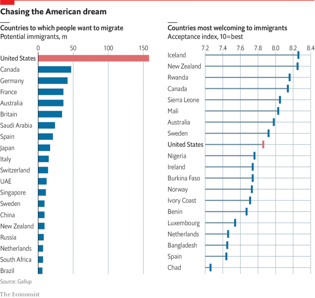Below are two charts from the Economist magazine. The first shows that the USA is the top choice of potential immigrants; the second shows that Iceland is the most welcoming country towards immigrants. Iceland? I taught management classes there and was the darkest person I saw. Apparently, it's easy to be welcoming in the abstract. Or maybe the Economist pulled the findings out of its nose.